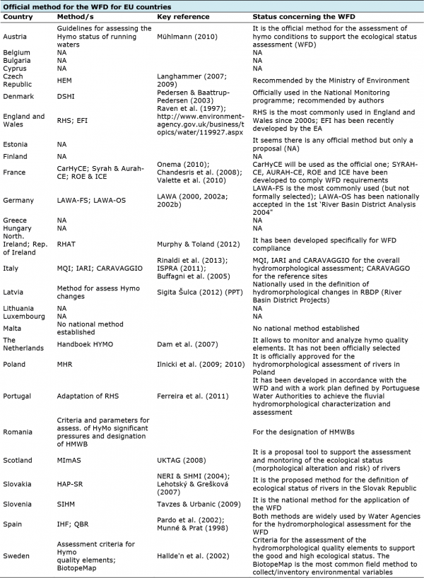 Table 1. Census of hydromorphological methods and/or assessment criteria applied in each European country for the implementation of the WFD (NA = information not available).
