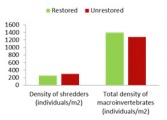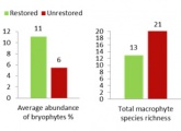 Macrophytes: Especially bryophyte abundance was higher in the restored section (see figure below), which are important for the functioning of boreal streams because they provide habitats for other biota, trap sediment and serve as a feeding area for aquatic insects. However, total species richness of macrophytes was lower in the restored section.