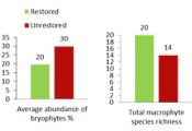 For macrophytes, total species richness was higher in the restored reach. However, the average abundance of bryophytes was slightly lower in the restored reach.